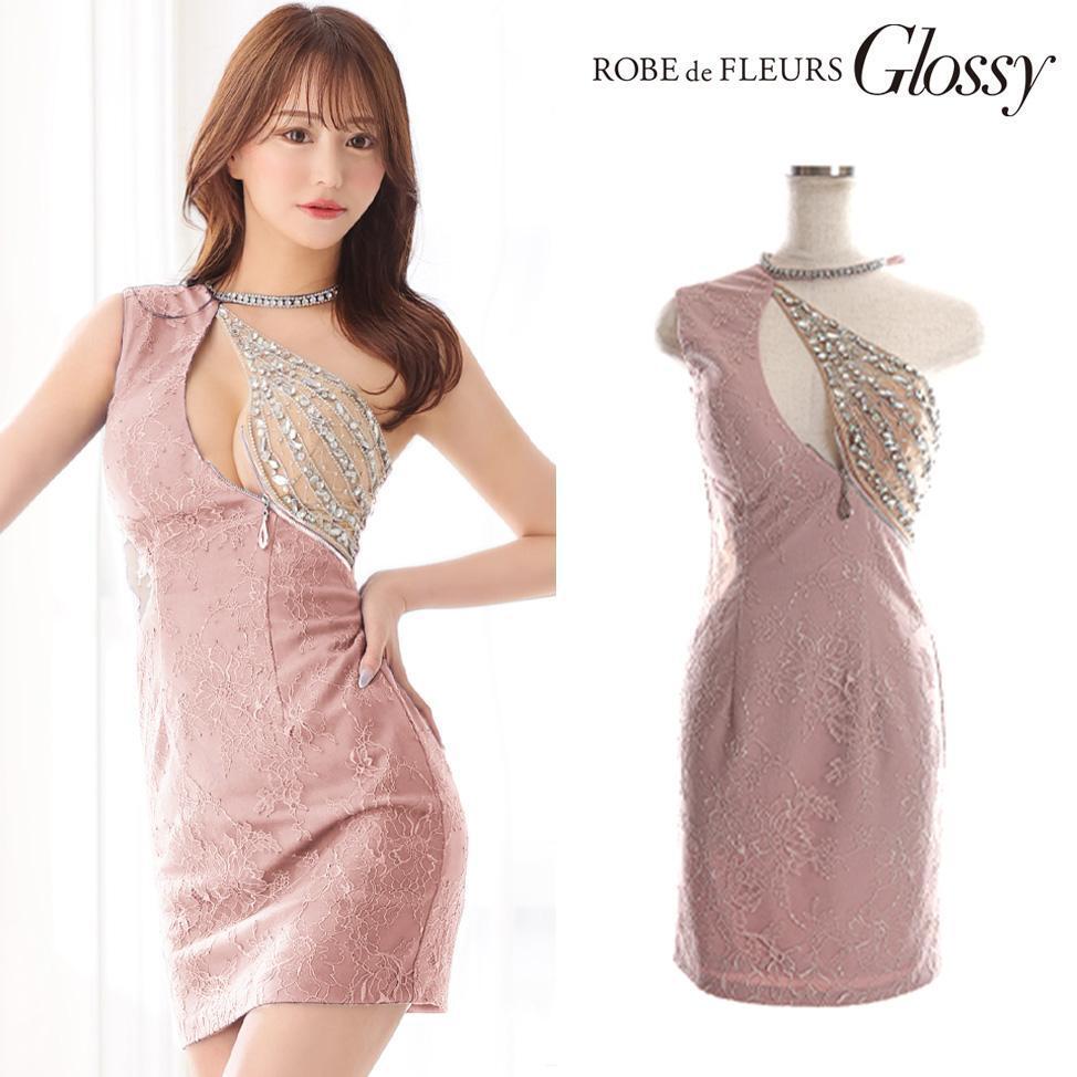 > ROBE de FLEURS Glossy ローブドフルールグロッシー アシンメトリービジューxジッパーストレッチタイトキャバドレス ピンク