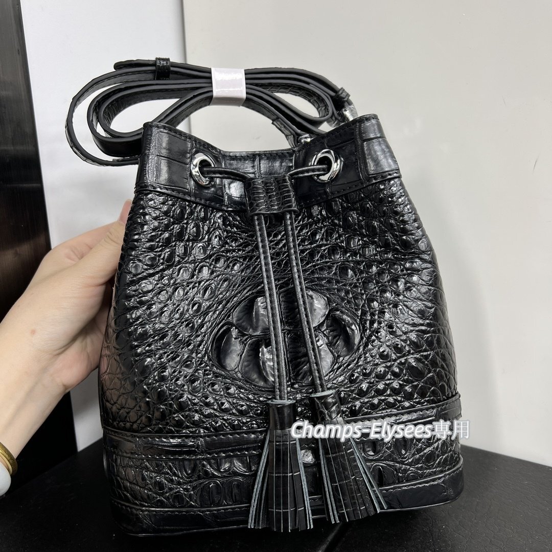 - 新感覚 貴重品 革リュック 1点もの 本物ワニ革 骨革 クロコダイルレザー バケツバッグ 純水染め黒 肩掛け