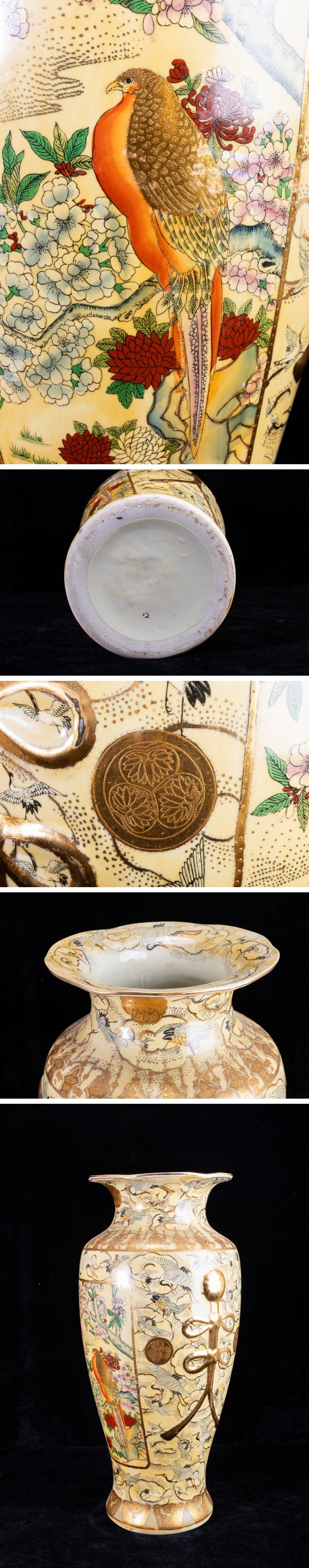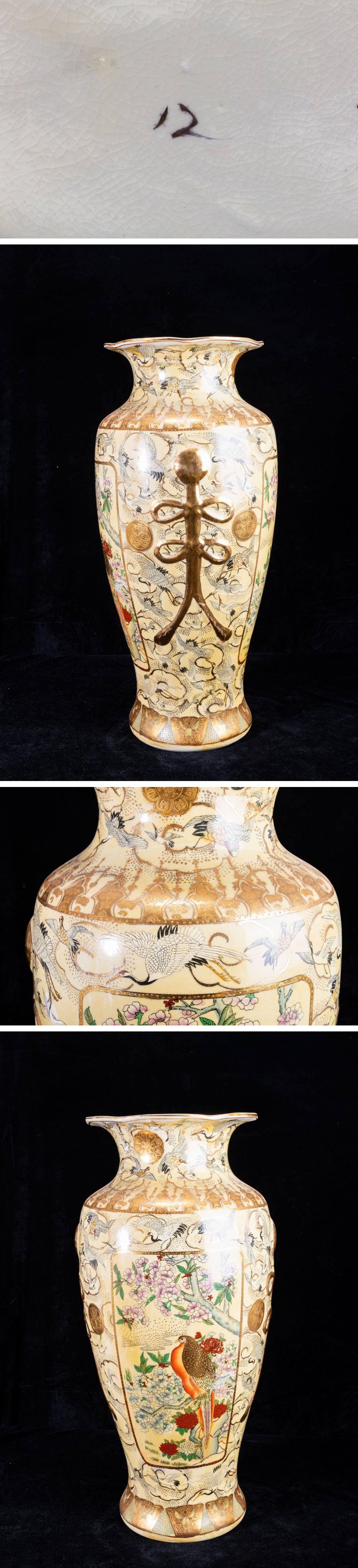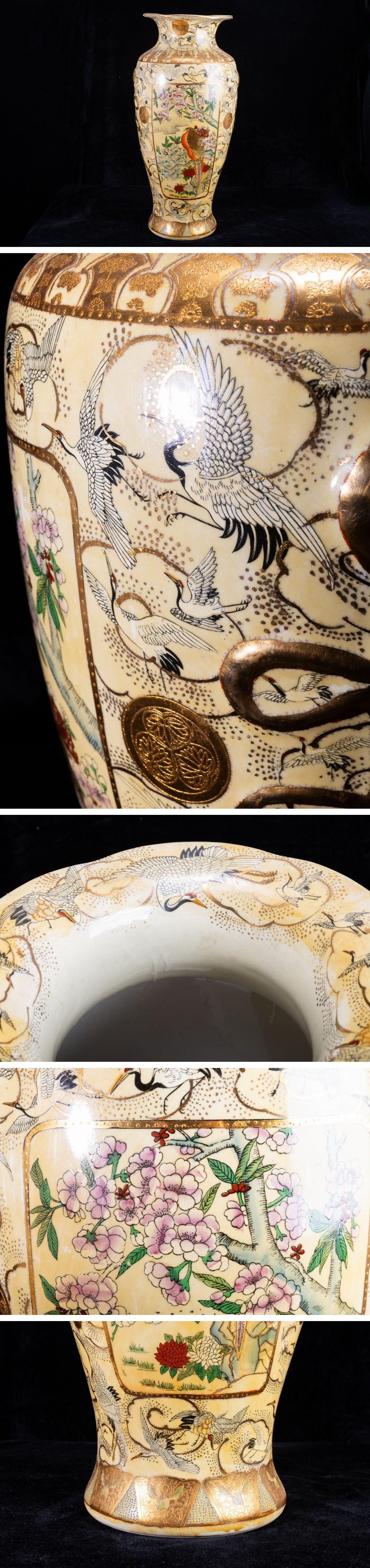 > 【珍品堂】1円から R73-V2 薩摩焼 栄盛窯 瀧山作 金蘭手 金彩 豪華絢爛 鶴花文 細密絵付 希少 特大花瓶 飾壺 高61cm 時代物 古美術 骨董品
