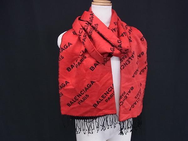 > 1円 ■美品■ BALENCIAGA バレンシアガ フリンジ マフラー ストール 防寒具 メンズ レッド系×ブラック系 FJ7633