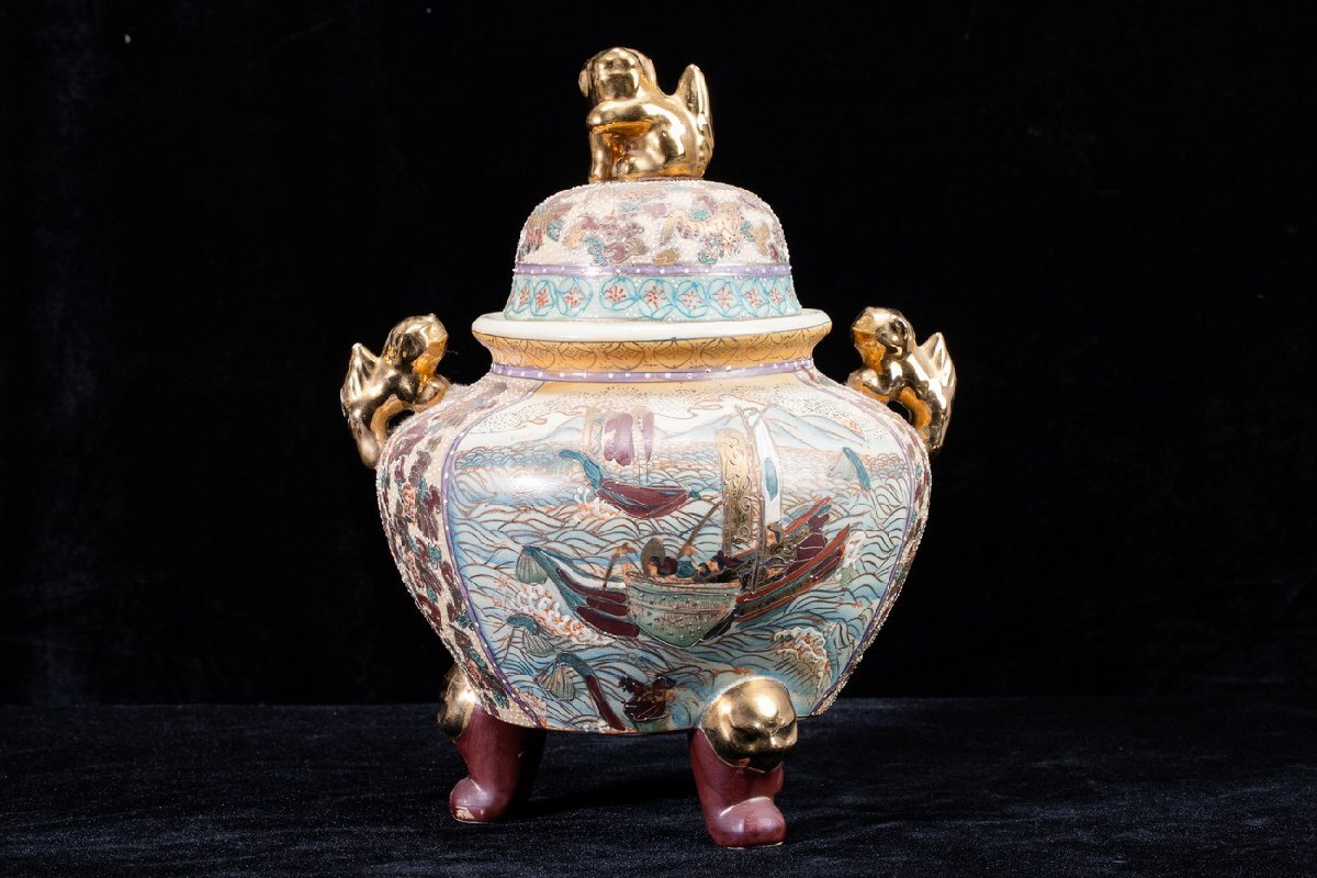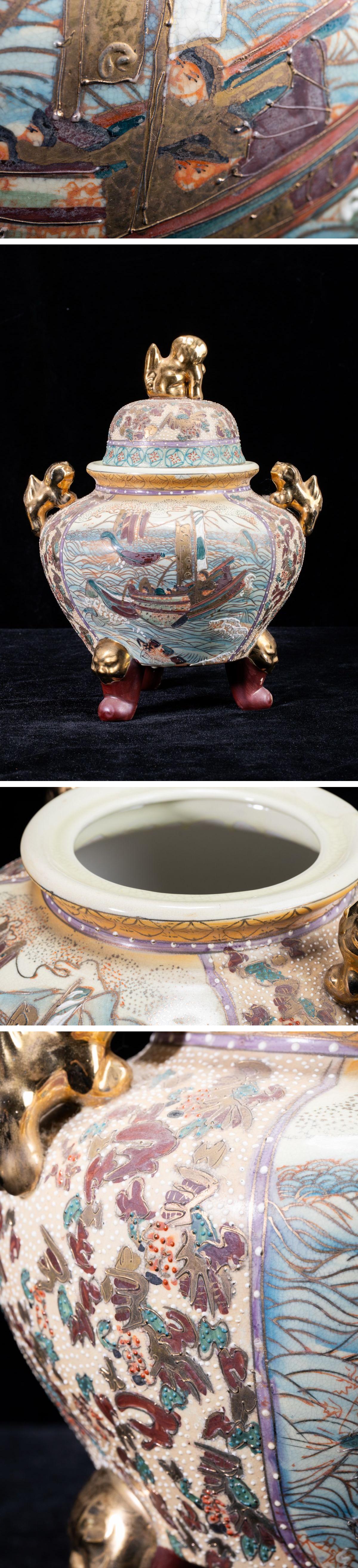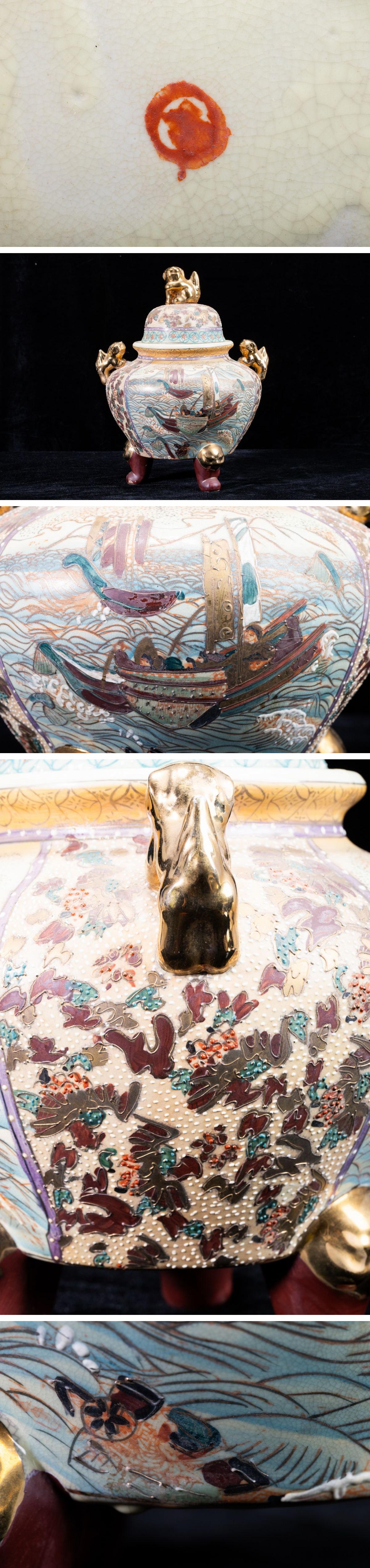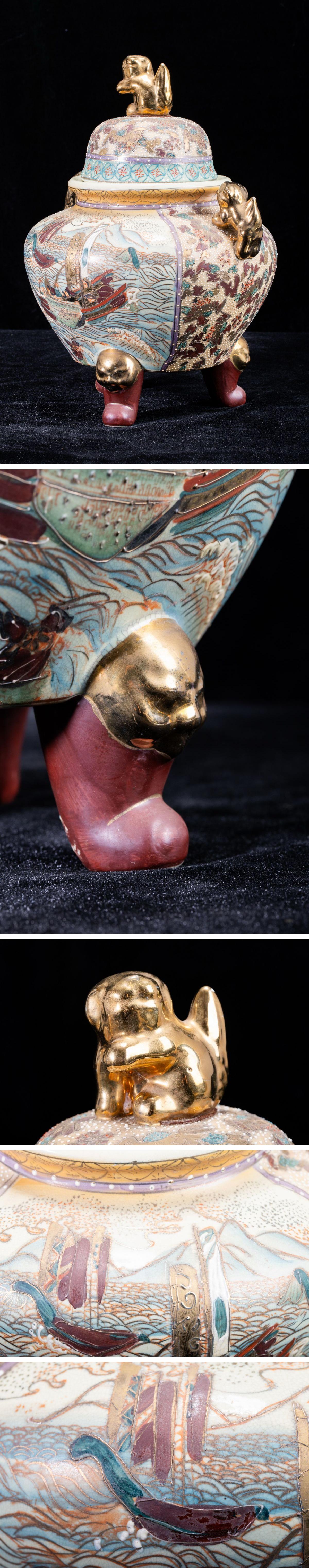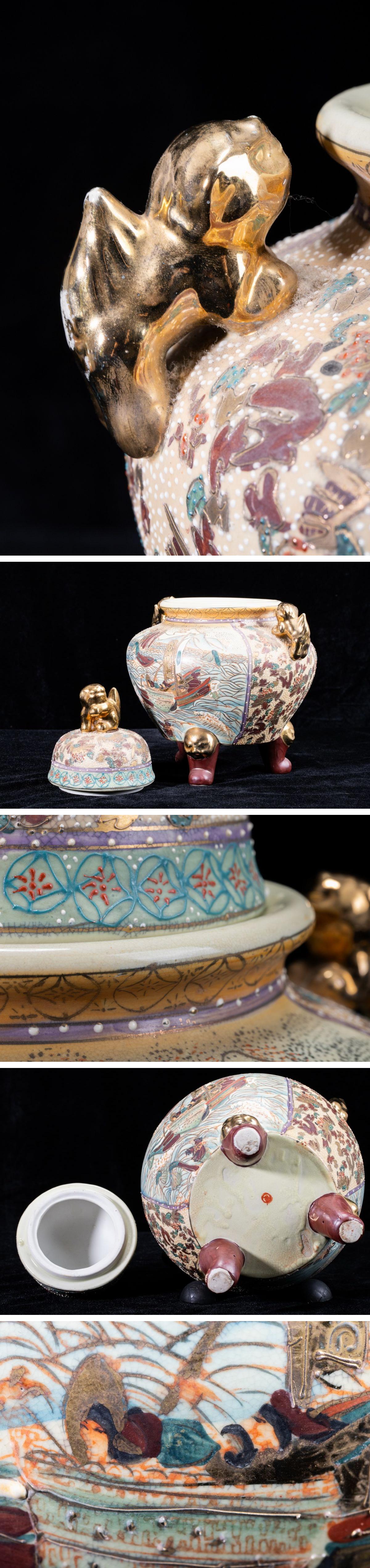 - 【珍品堂】1円から R15-V1 薩摩焼 金彩 色絵 獅子双耳 獣三足 蓋付 染錦 細密細工 香炉 高34㎝ コレクション 茶道具 時代物 骨董品 古美術