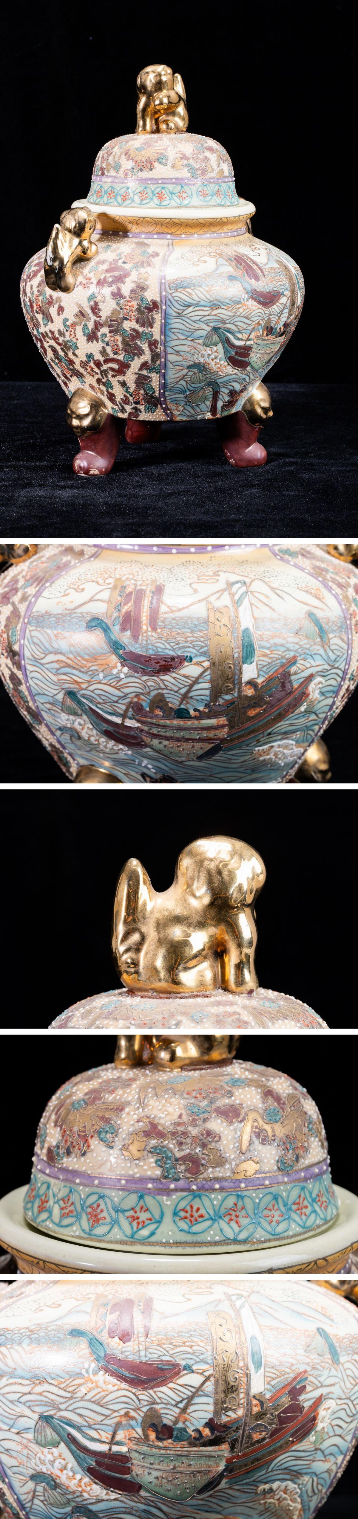 > 【珍品堂】1円から R15-V1 薩摩焼 金彩 色絵 獅子双耳 獣三足 蓋付 染錦 細密細工 香炉 高34㎝ コレクション 茶道具 時代物 骨董品 古美術