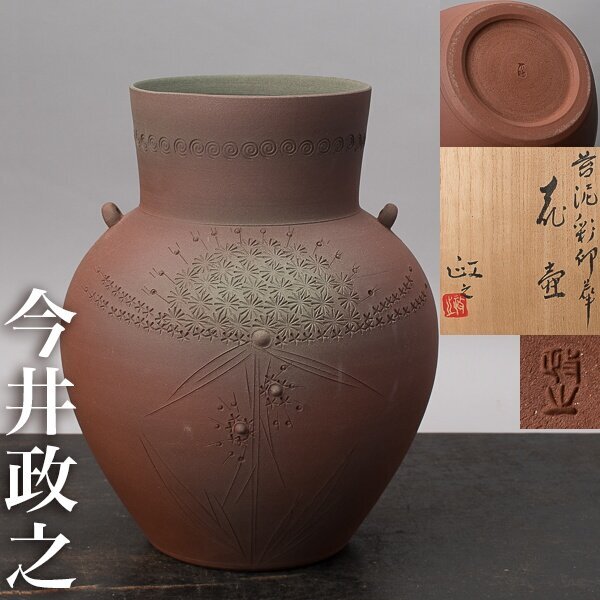 > 【千h0100#a】今井政之 苔泥彩 印華 花壺 高さ約22cm 共箱 泥彩 壺 壷 花器 花入 花瓶