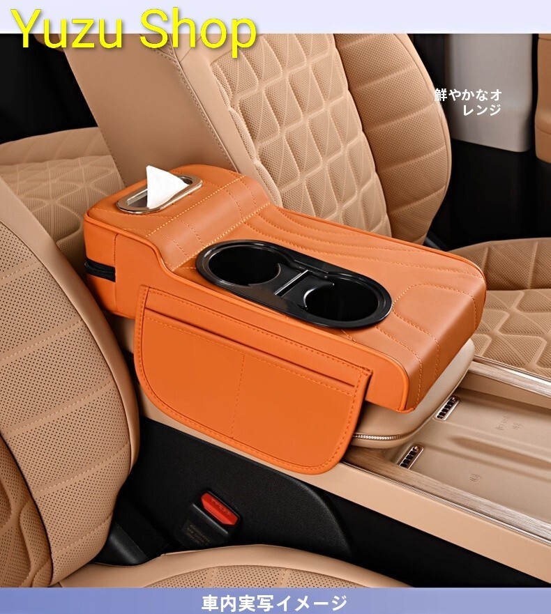 > 汎用アームレスト 疲労軽減 センターコンソールボックス ドリンクホルダー 車肘掛け 手置きクッション 多機能ティッシュボックス オレンジ