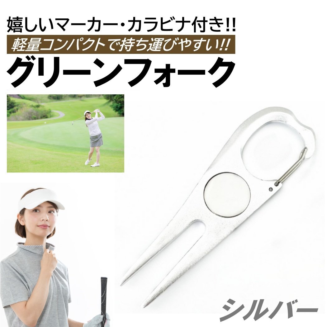 - 銀 グリーンフォーク ゴルフ マーカー カラビナ シンプル ラウンド リペアツール ピッチマーク コンペ 軽量 ディボット ツール