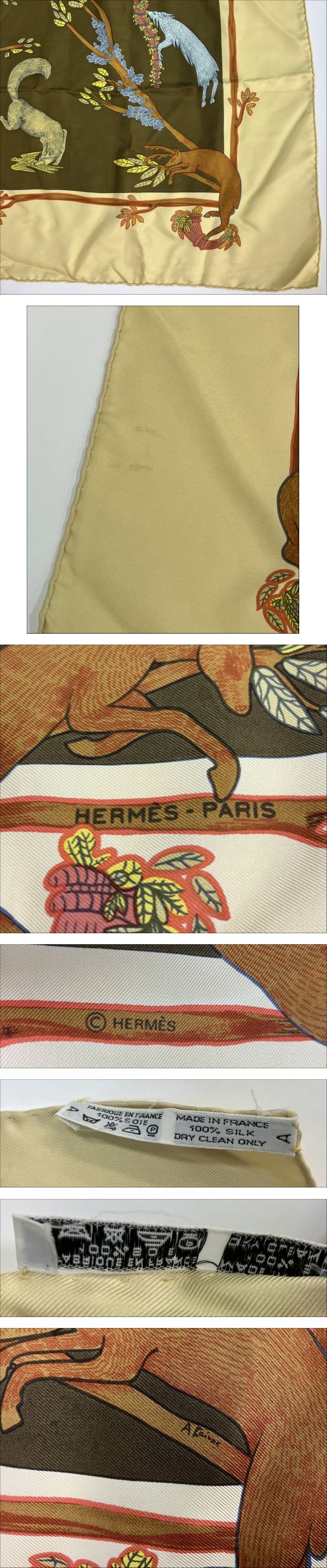 > E0002-2511-0159 1円出品 エルメス HERMES カレ90 大判 スカーフ ストール アニマル アルファベット シルク100% イエロー×ブラウン系
