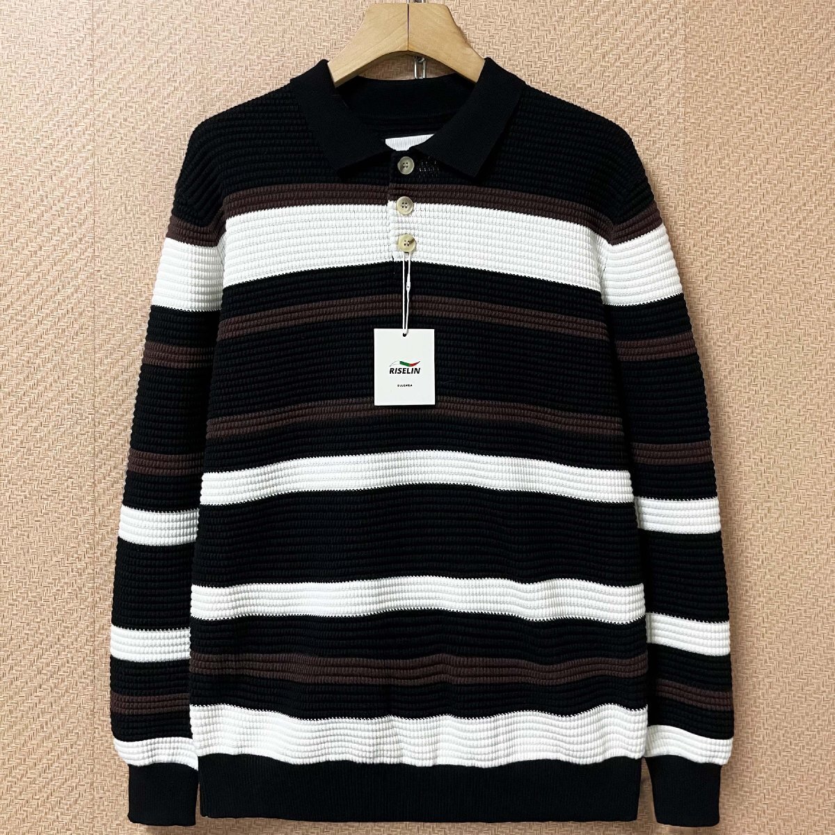 - 個性ヨーロッパ製※定価4万◆ブルガリア発※RISELIN セーター ウール混 柔らか ストライプ柄 ポロ襟 ニット カットソー カジュアル XL/50