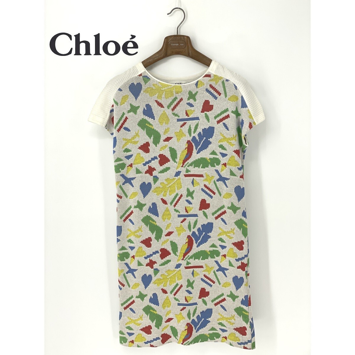 - A9310/美品 春夏 Miss Chloe ミスクロエ コットン 総柄 半袖 おしゃれ デザイン ミニ 膝丈 ニット ワンピース 40 L程 白 レディース