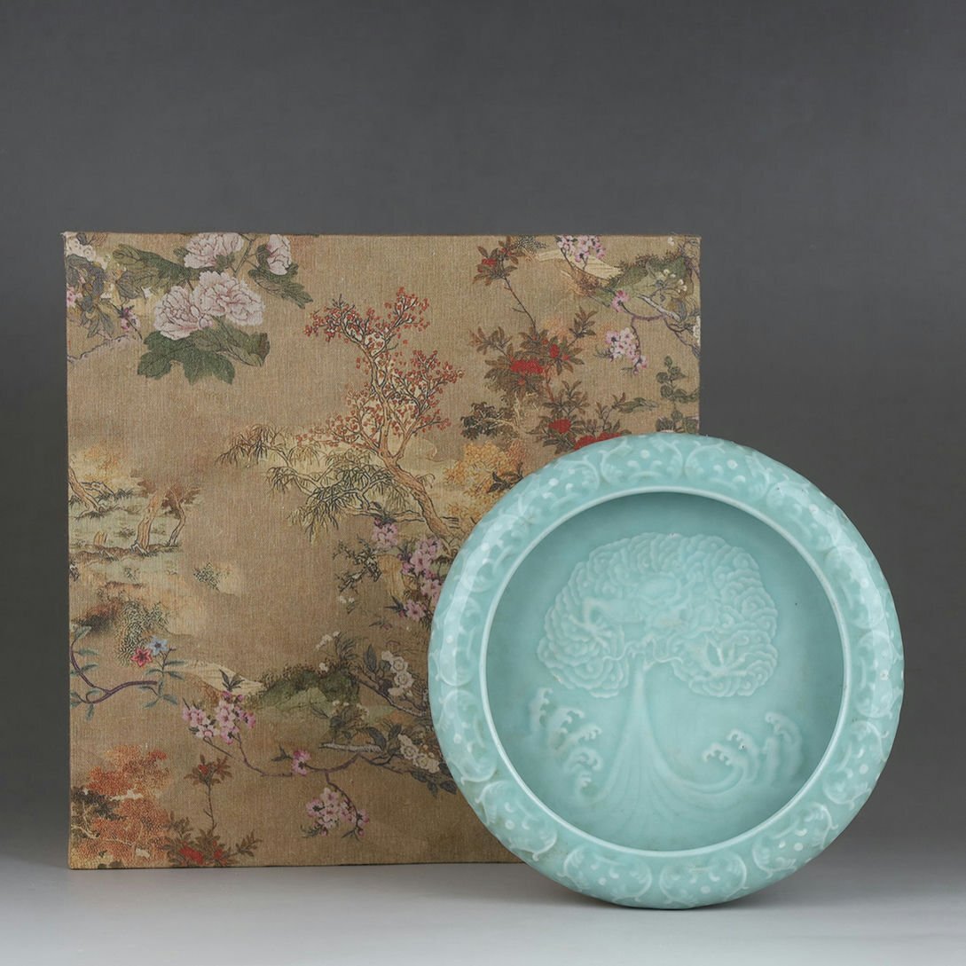 - ▼渡鶴羽▼A0739清代 天青釉彫刻海水龍紋洗・古陶磁器 ・珍品旧蔵・古賞物・時代物