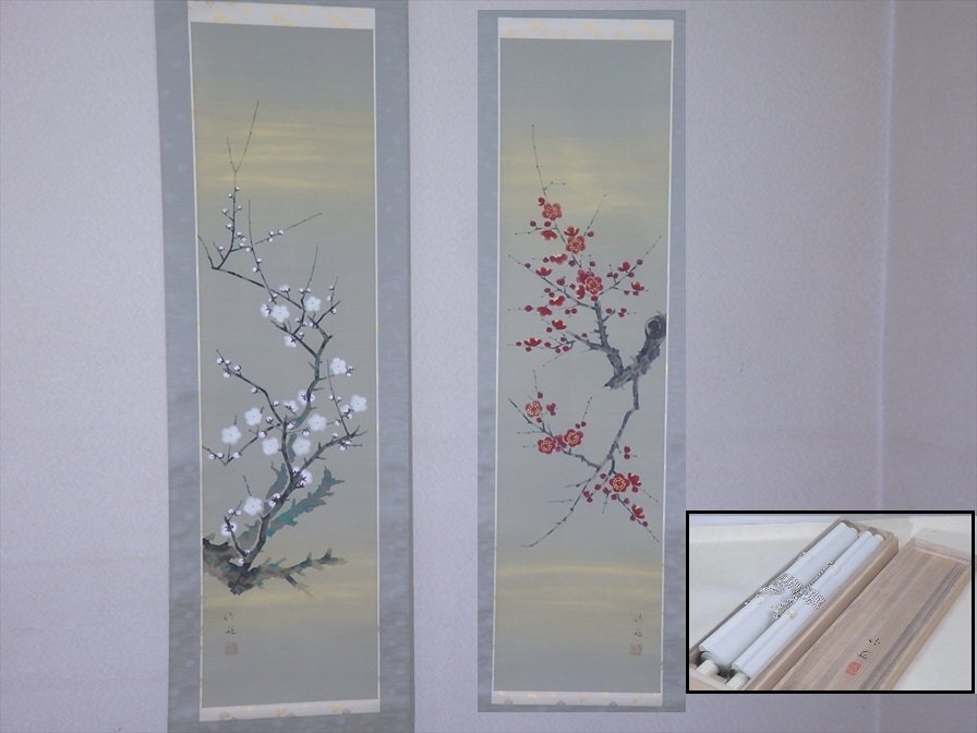 - ★美品!中村竹庭 肉筆【掛軸2本セット『紅白梅 対幅』共箱】絹本 彩色 幅39.5×全長189.3cm 正月 日本画 茶道具 新春 茶掛け