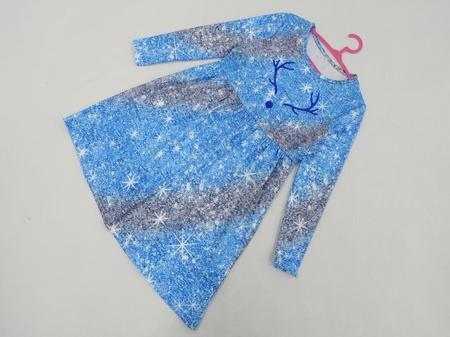 > キッズ 美品 ひざ丈 長袖 ラウンドネック ワンピース 110 ブルー×ホワイト×ネイビー 総柄 【メール便可】