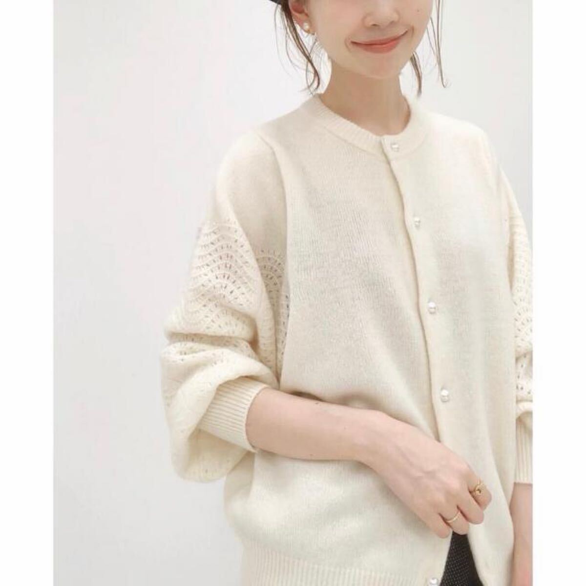 - ∞ slobe iena ウール カシミヤ 柄編み カーディガン ニット プルオーバー パールボタン フワリ袖 羽織り 白 ∞
