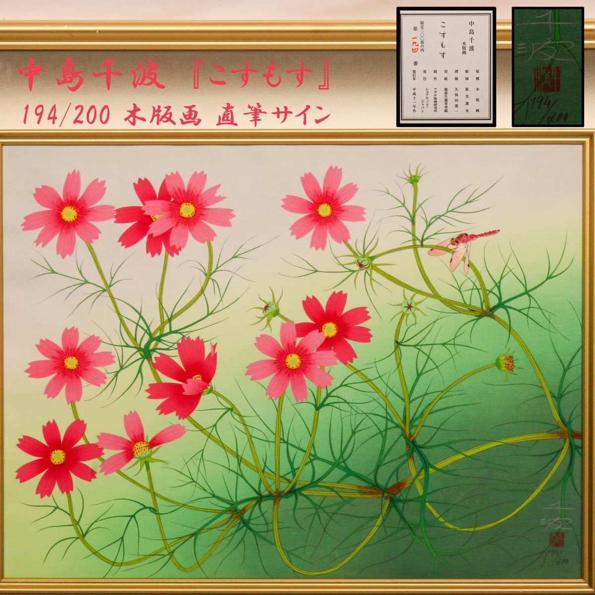 > 【SAG】中島千波 幅68.5㎝『こすもす』194/200 木版画 直筆サイン 落款 額装 ショアウッドジャパン発行証 タトウ箱 本物保証