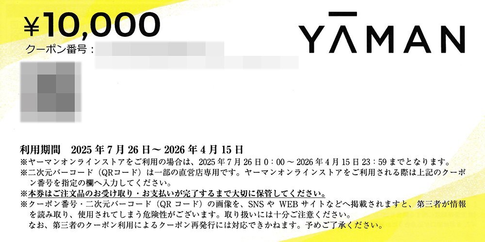 - ヤーマン 株主優待 10000円クーポン1枚 4月15日まで YAMAN 送料込