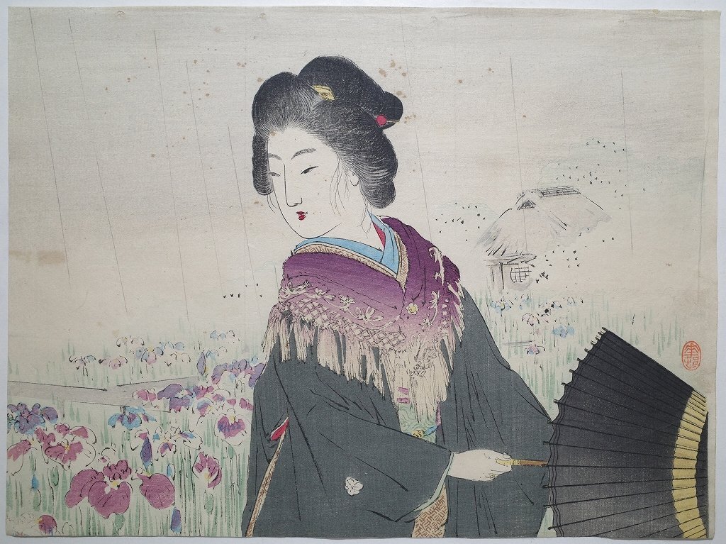 - 鈴木華邨【あやめ】■口絵 浮世絵 錦絵 美人画 傘 木版画 摺物 明治40年 古書 和本 Ukiyoe
