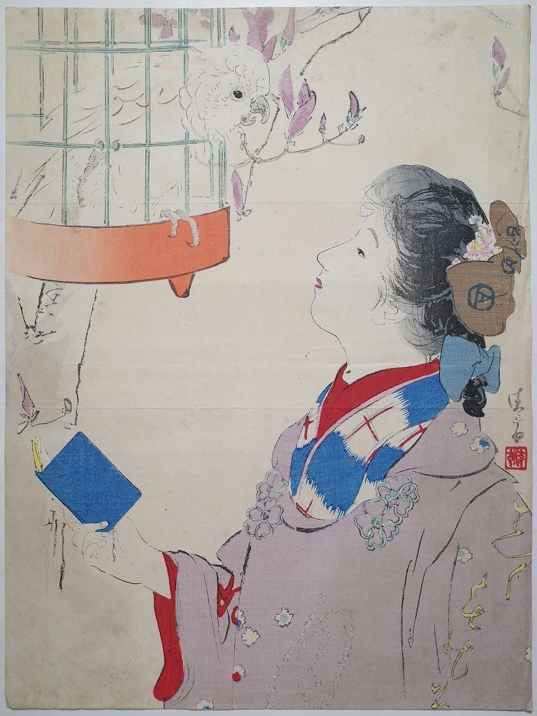 - 鏑木清方【鸚鵡】■口絵 浮世絵 錦絵 美人画 鳥 オウム 木版画 摺物 明治40年 古書 和本 Ukiyoe