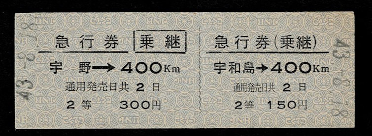 - 国鉄 予讃本線 宇野線 四国~本州 乗継一様急行券 2等 宇和島から400キロ 宇野から400キロ 宇和島駅発行 昭和43年