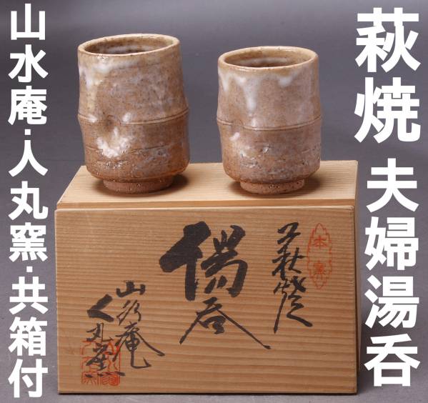 - 萩焼 夫婦湯呑み 2客 ペア 山水庵 人丸窯 共箱付き 美品 KA-6264
