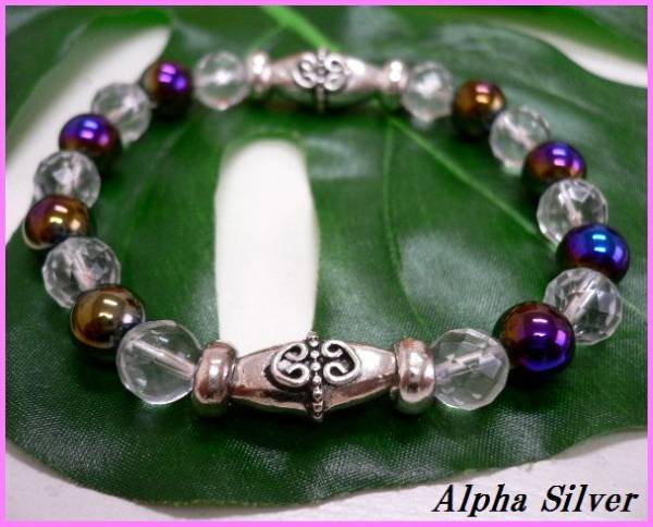 - シルバー925銀パーツ付 天然石オニキスオーラ×カット水晶8mm数珠ブレス/ラスト1点