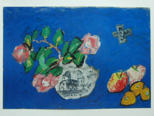 - 中川一政、椿と林檎と蜜柑、限定版・希少画集画、新品高級額装付、mai