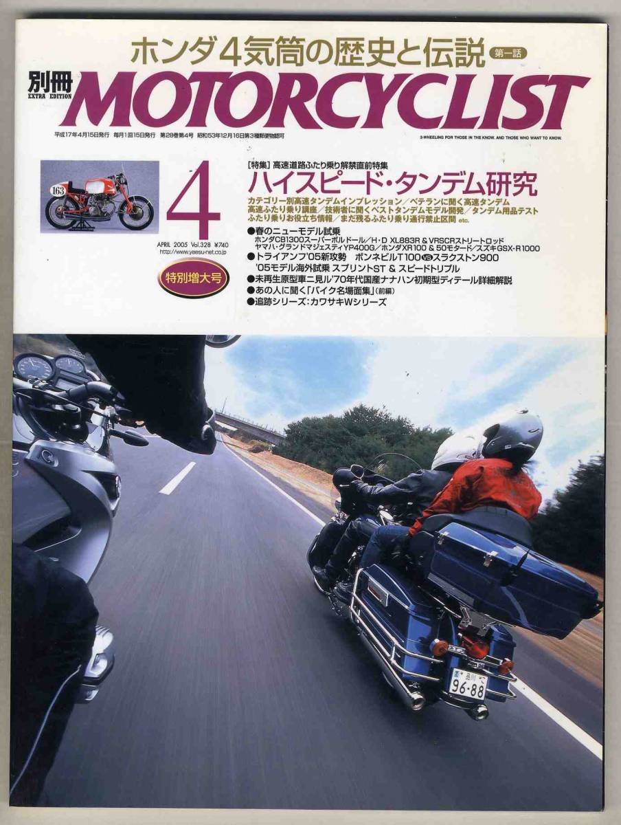 書名/記事: 05.4 別冊モーターサイクリスト/ハイスピードタンデム研究、ホンダCB1300スーパーボルドール、ハーレーダビッドソンXL883R/VRSCRストリートロッド、ヤマハグランドマジェスティYP400G、ホンダXR100/50モタード、スズキGSX-R1000、トライアンフボンネビルT100 vs スラクストン900、カワサキWシリーズ、…
