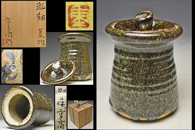 - 加藤重高 ★ 斑釉蓋物 ★ 共箱共布栞 ★ 検 加藤唐九郎 岡部嶺男 織部 黄瀬戸 志野 瀬戸黒 ★