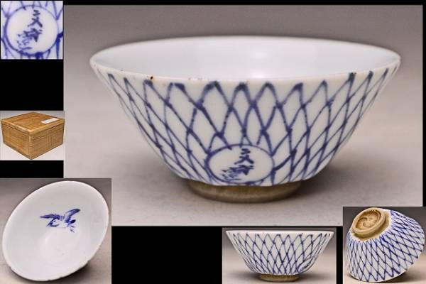 - 高島文平 か ★ 網目染付ぐい呑 ★ 木箱 ★ 見込みの鳥 ★ 検 清水焼 古染風