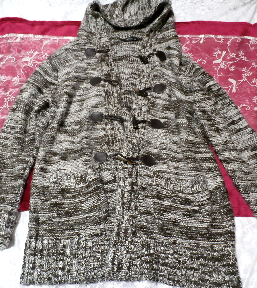 > フード付き灰色白黒シマシマ貝殻ボタン手編み状ロングカーディガン/羽織 Hooded gray monochrome seashell button hand knit long cardigan