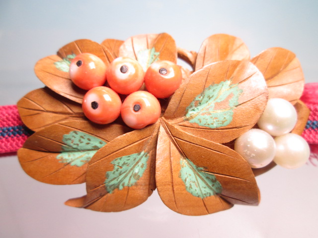 - ☆アンティーク・光林作 彩色木彫 本珊瑚玉&本真珠飾りの大振りな帯留め