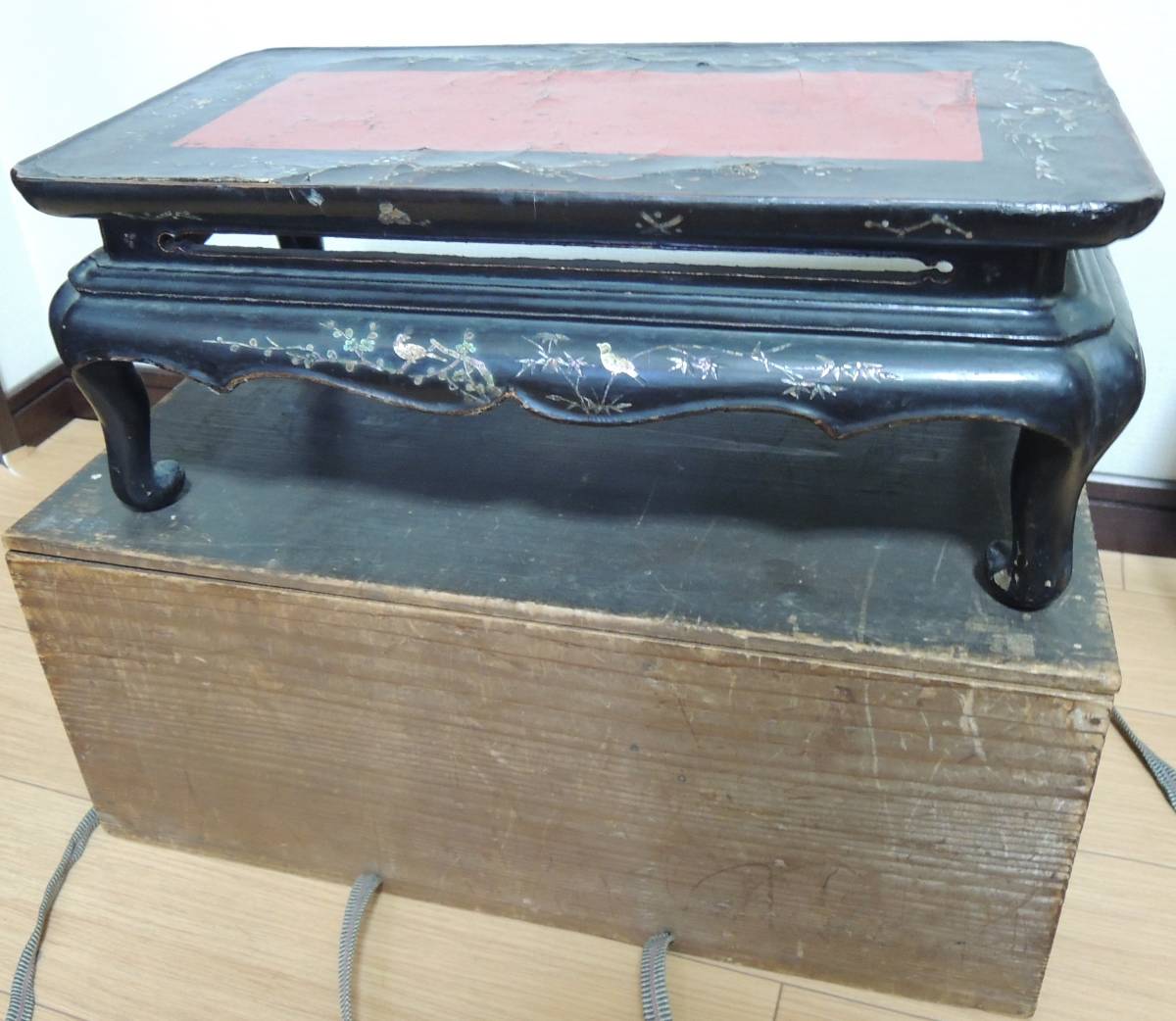 明代(梅花断紋) 黑漆細密螺鈿彫 花鳥絵 青貝卓 共箱 茶道具 唐物