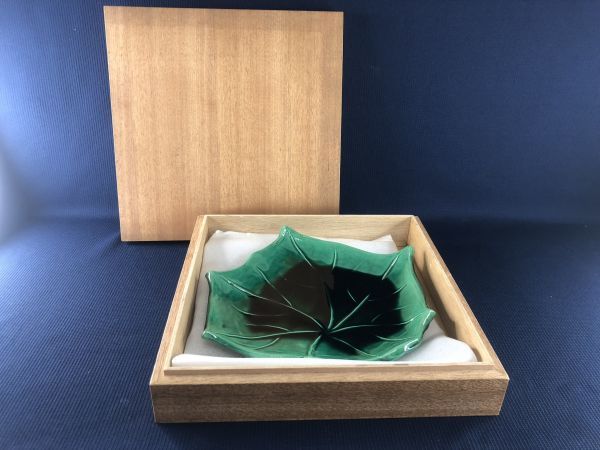 - 未使用品★ 刻印あり 葉型皿 緑色 刻印あり 共箱あり管理1805 K-6