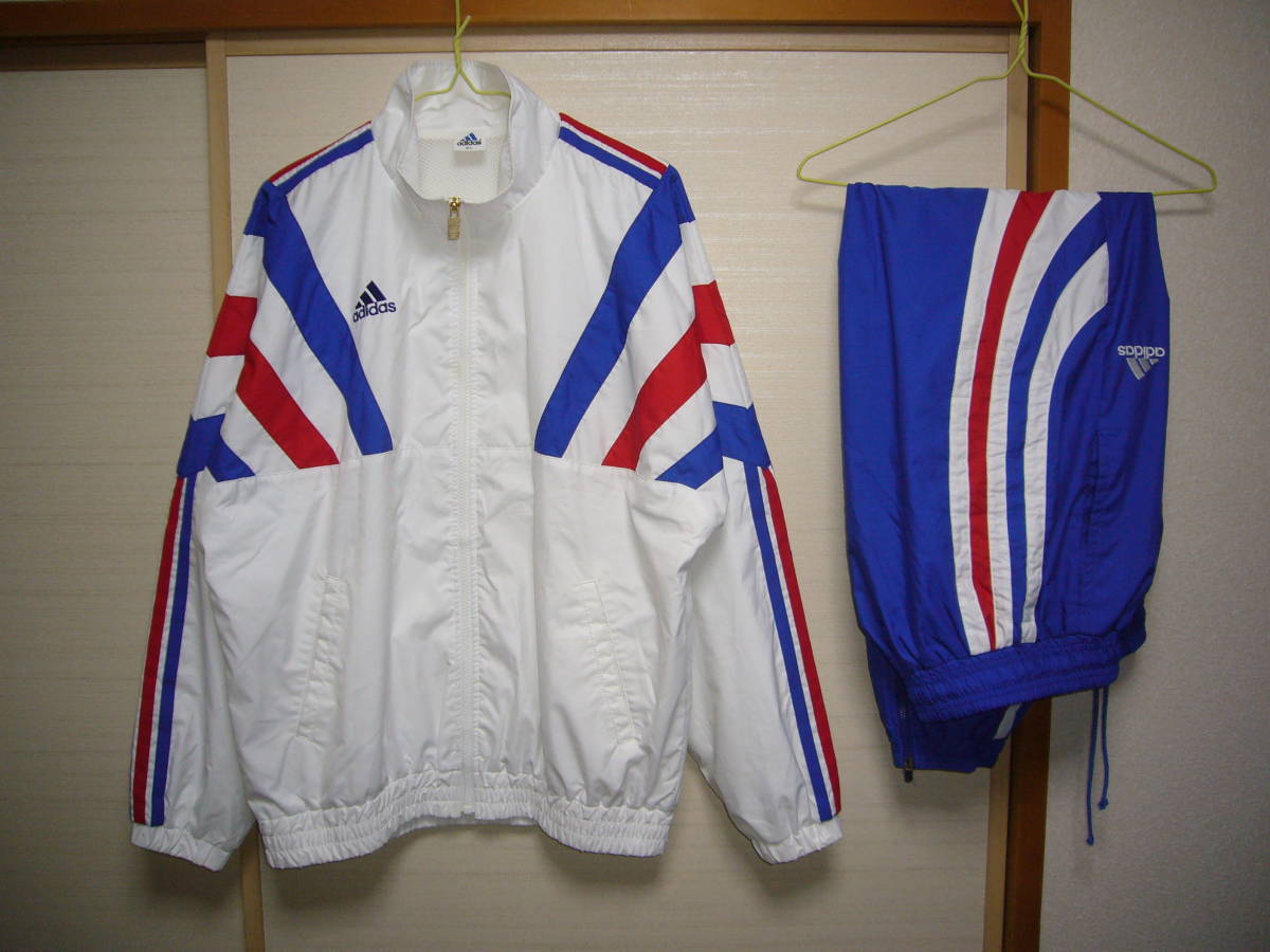 > アディダス ナイロン上下 白×赤青 M~Lサイズ トリコロール 難あり