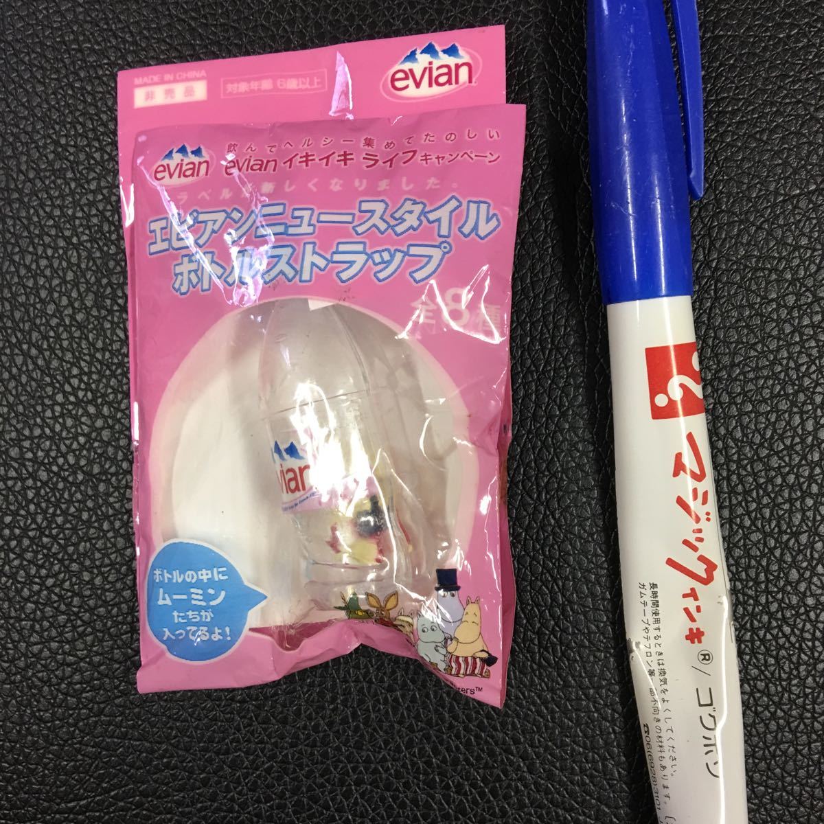 > エビアン、エビアンニュースタイルボトルストラップ、ボトルの中にムーミンたちが入ってる、ムーミンママ、劣化してます