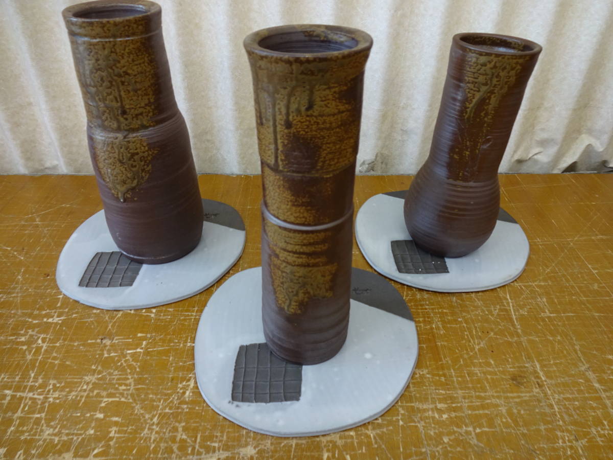 - ■□陶器 花瓶 花器 陶器製 花瓶敷き 花瓶台付き 備前焼? 立杭焼? 3種セット□■