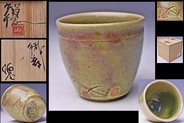 - 小山智徳 ★ 織部ぐい呑 ★ 共箱 ★ 酒器 ★ 師: 瀧口喜兵爾 ★ 辰砂の様な赤味が現れた逸品 ★