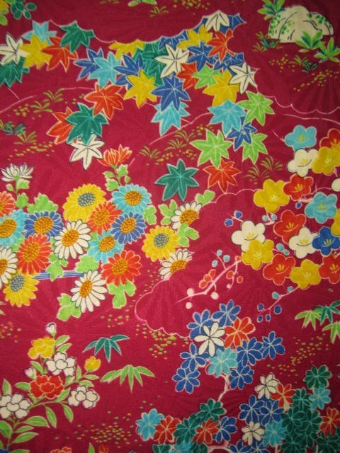 - 着物古布=236★薔薇*菊*萩*キキョウ*紅葉*松竹梅*綸子*古布はぎれ★人形/吊るし雛