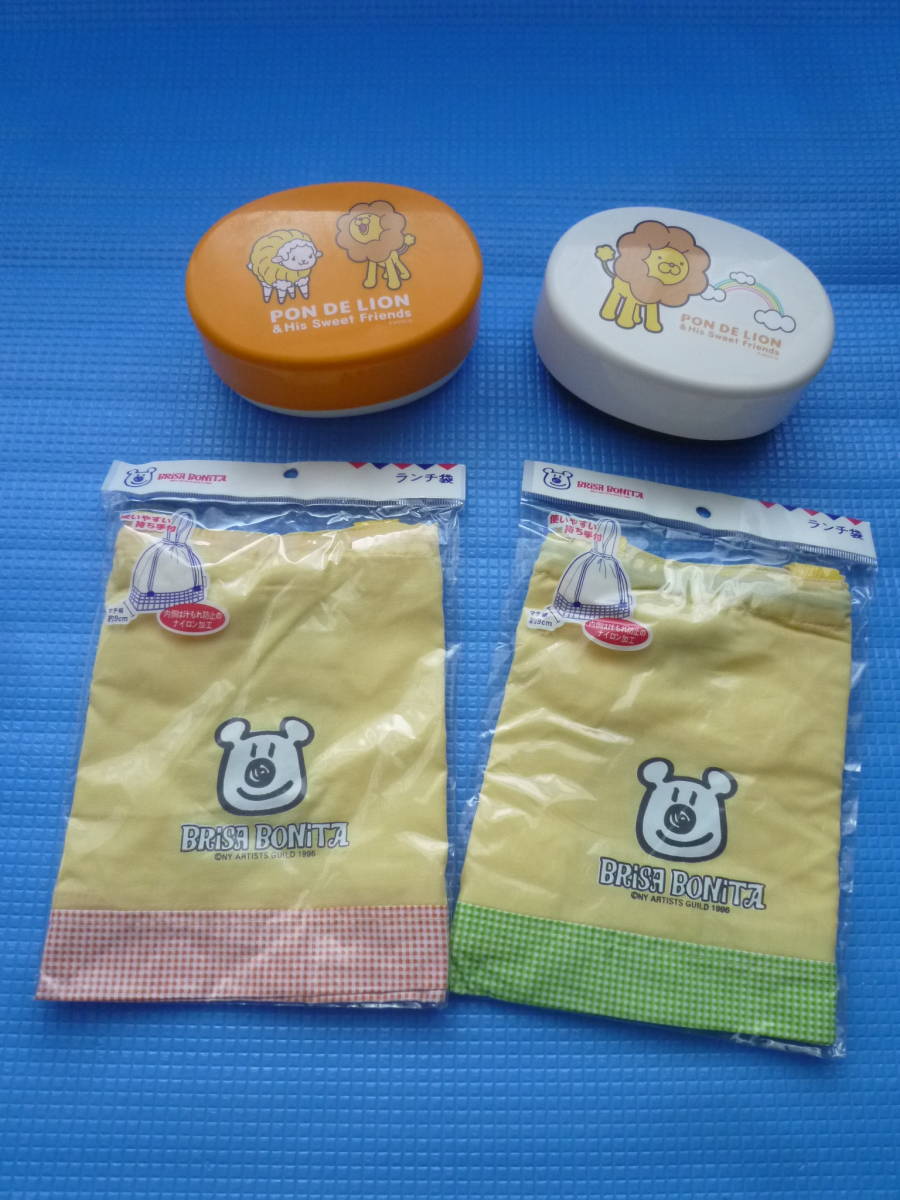 - a★非売品・未使用★ミスド ポン・デ・ライオン2段式弁当箱(ランチボックス)×2種とランチ袋2枚