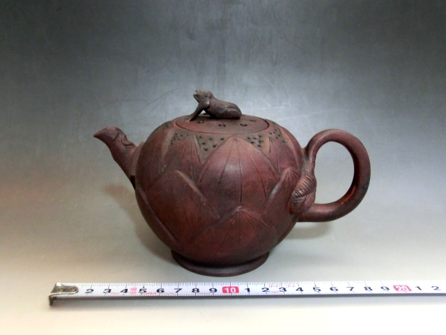 - 急須■中国 朱泥 蛙 蓮 東暁茜製?在銘 睡蓮 紫砂 茶瓶 古玩 唐物 中国 古美術 時代物 骨董品■