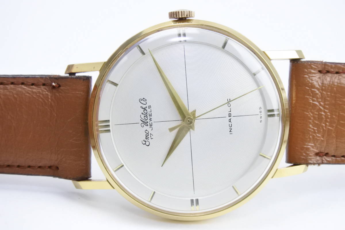 - デッドストック 1950年代頃 スイス製 EMO WATCH CO 17石 手巻紳士腕時計 税関シール付 当時ベルト*極稀少品