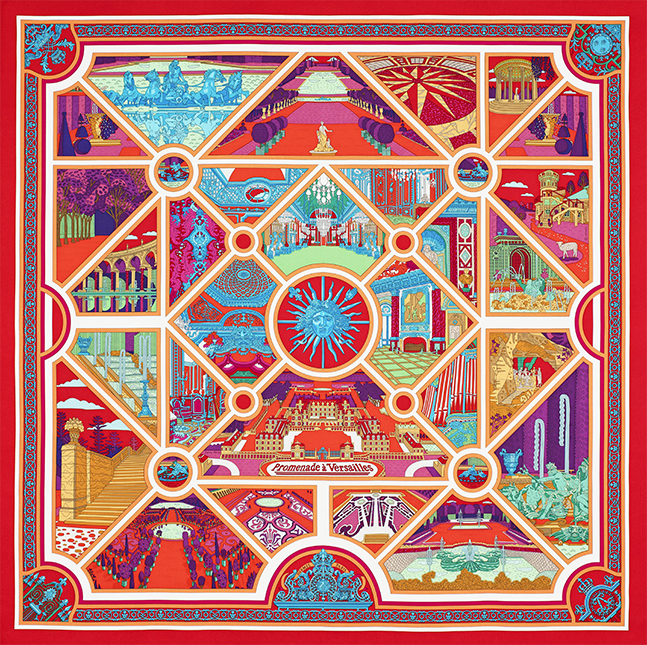 - 日本未発売 HERMES エルメス スカーフ 限定 完売 コラボ ヴェルサイユ宮殿 カレ90 新品 フランス製 シルク Promenade a Versailles 庭園 赤