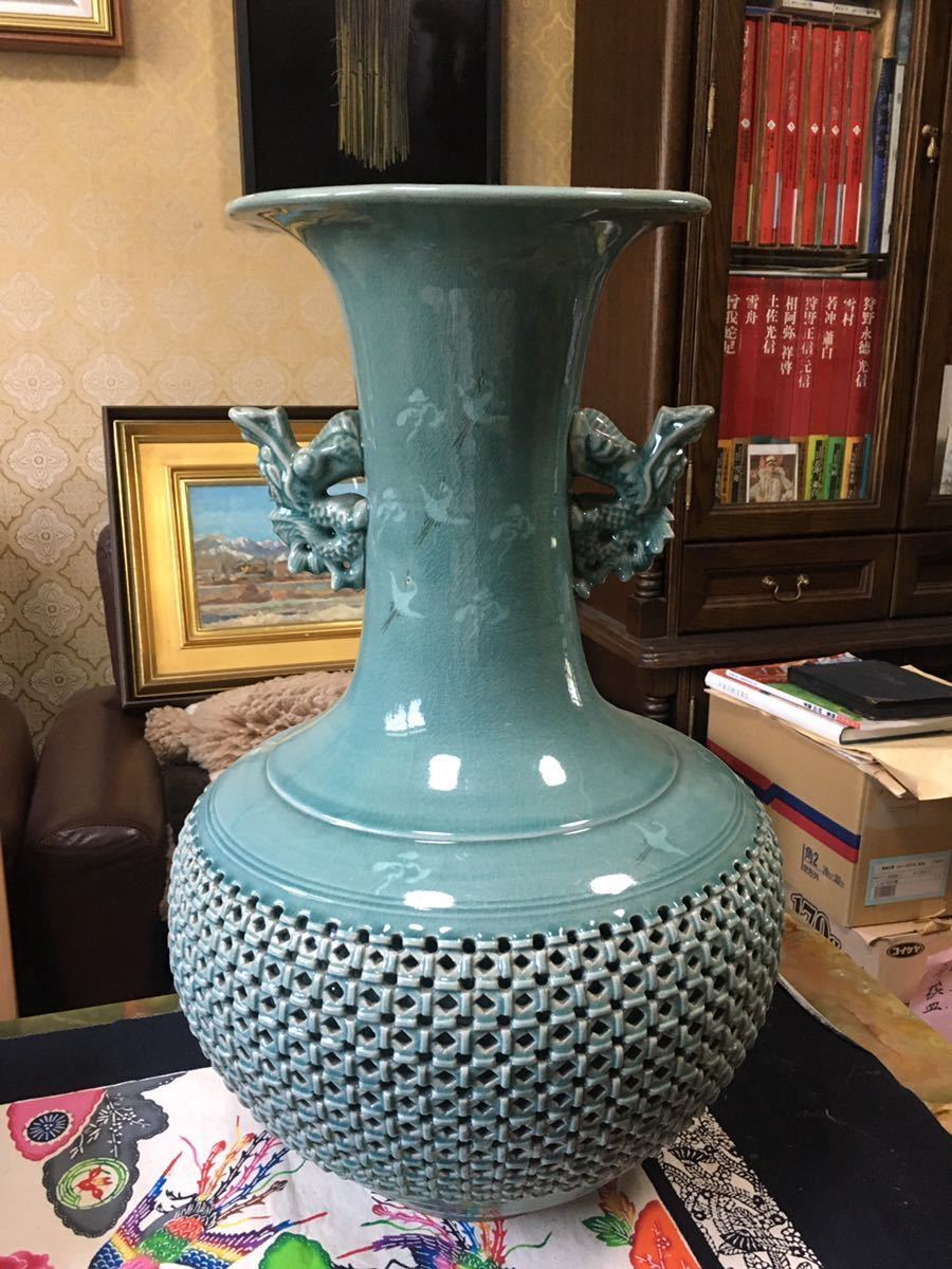 - 【置物】花瓶 朝鮮韓国朝鮮 青花 青磁 青山 鶴翔 双耳花瓶 高約62cm 透彫雲鶴図/網目/飾花瓶/特大/陶磁器/骨董/古美術/陶芸民芸/玄関置物