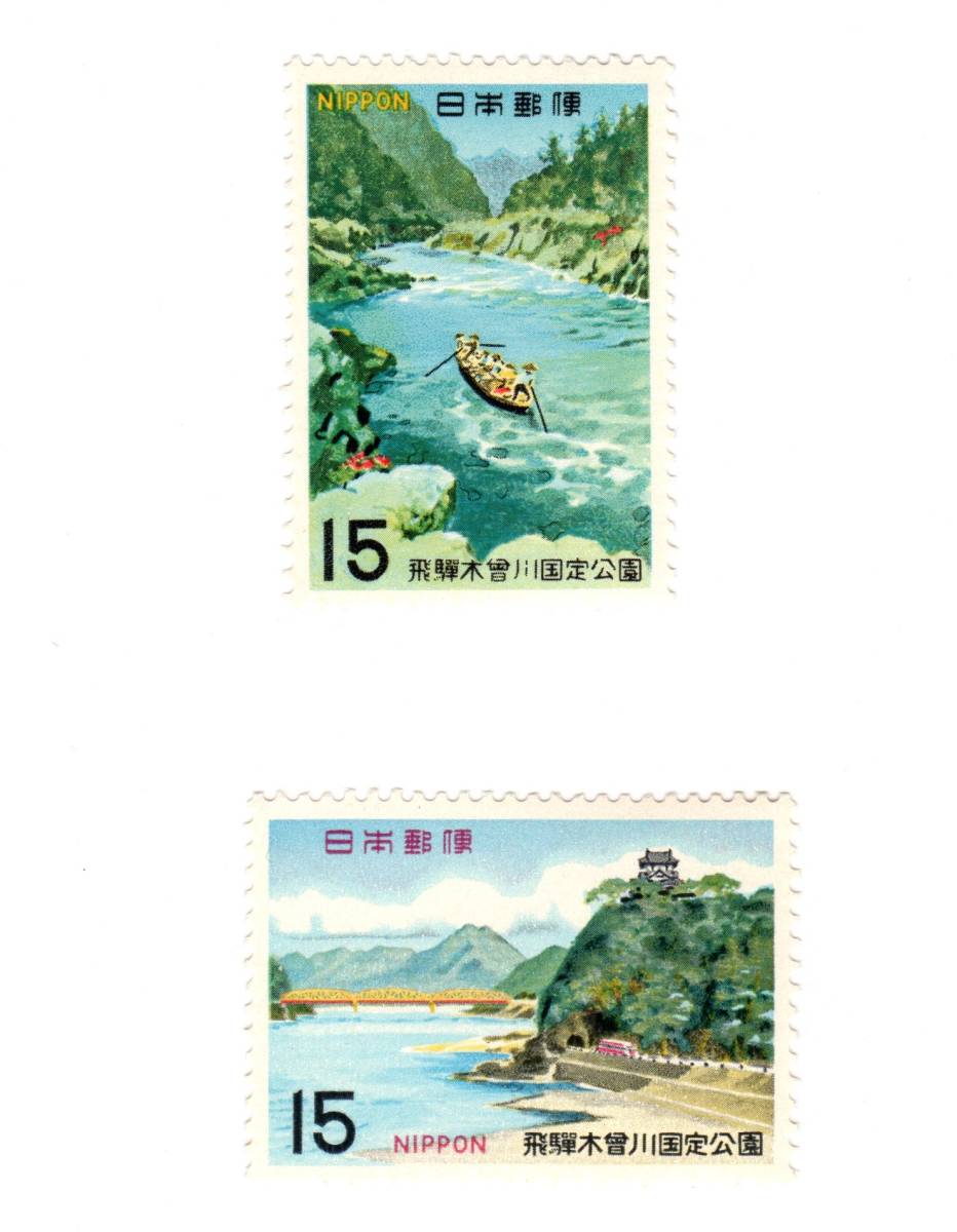 - 昭和43年1968「国定公園切手 飛騨木曽川/木曽川~犬山城と木曽川」15円切手2枚・未使用【送料無料】「熊五郎の切手」00800242