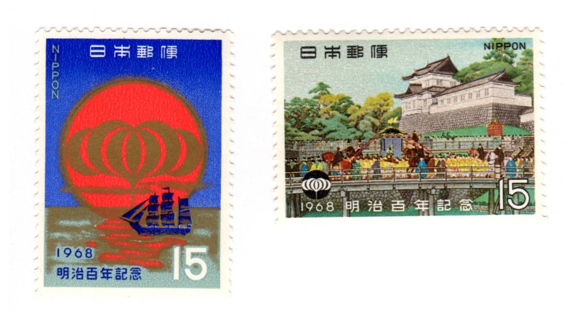 - 昭和43年1968「明治100年記念/百年祭マークと昌平丸~『東京御著輦』小堀靹音画」15円切手2種 未使用【送料無料】熊五郎の切手 00800392