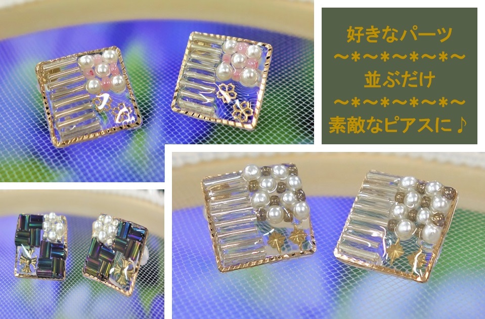- 【透明レジン仕上げ/小ビーズ幾何ピアス3組セット】送料無料/ハンドメイドアクセサリー
