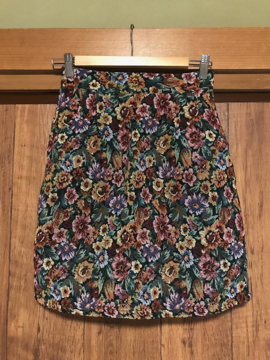 - Mサイズ スカート ミニ タイト 刺繍 ゴブラン 黒地 ブラック 可愛い お洒落 花柄 アンティーク ビンテージ ポケット付き 未使用 美品