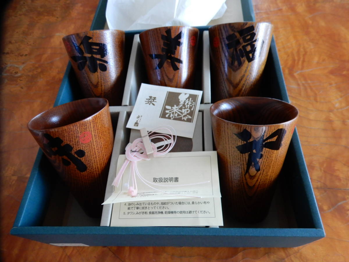 - ★新品未使用【美術漆器/栞】湯呑5客セット 美・和・味・楽・福 湯のみ