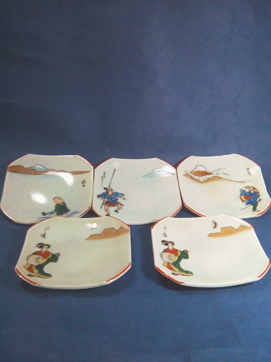 - 九谷焼 角小皿 5枚 東海道五十三次 和食器 絵付け 人物文 東海道 九谷 小皿 料理 盛り皿 絵 色絵 磁器 銘々皿 食卓