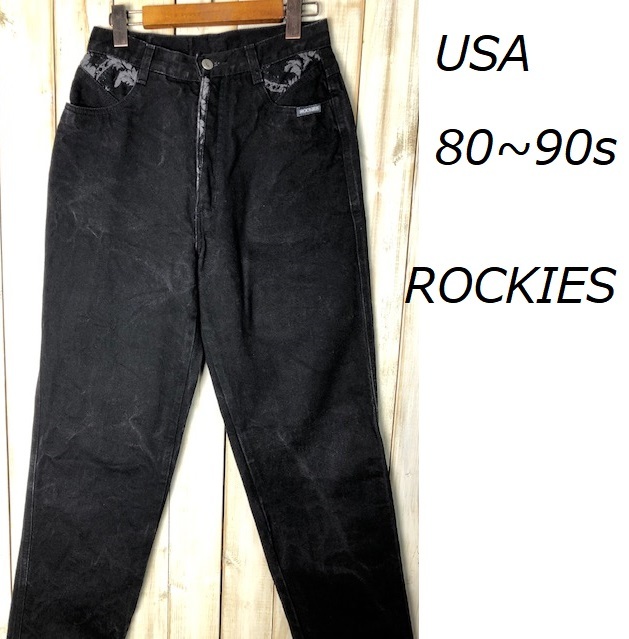 > USA古着 80s~ USA製 デザイン切り替え ブラックデニムパンツ 9/10 ROCKIES 黒 オールド ヴィンテージ ユニセックス ワイドテーパード ●30