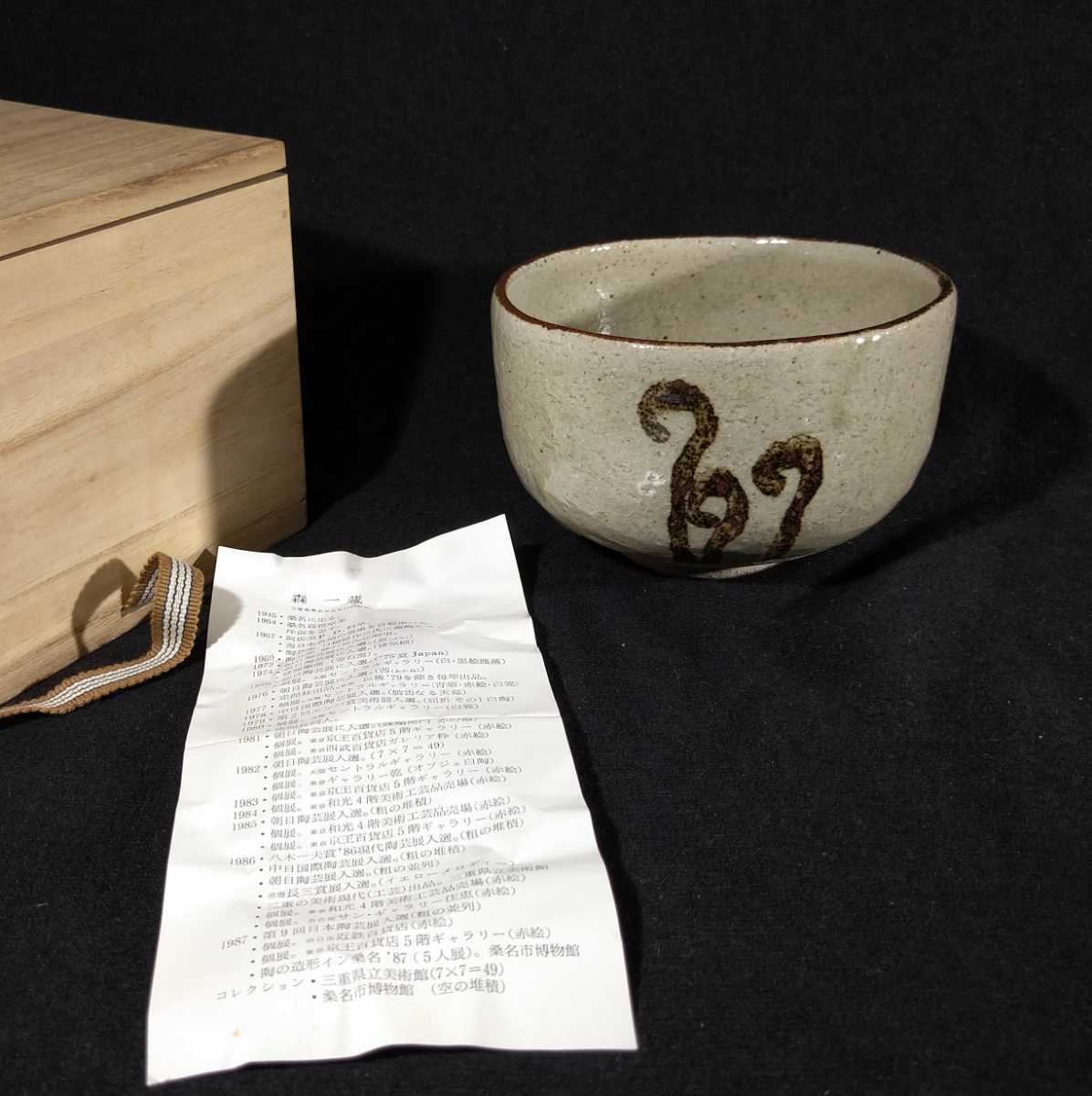 - 森一蔵 灰釉 蕨文 茶碗 合箱 黄布 a-50c1269