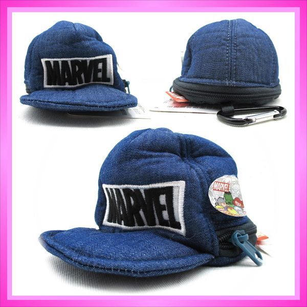 - MARVEL デニムキャップポーチ カラビナ付 ◆ ロゴプレート ホワイトVer. / 1点 美品